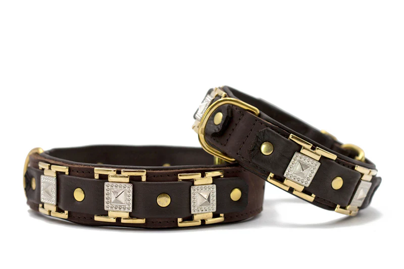 Das Lederhalsband „Texas“ überzeugt mit markantem Design und echter Handwerksqualität gefertigt in unserer eigenen Sattlerei an der hessischen Bergstraße. In den edlen Farbvarianten Cognac/Braun oder Schwarz/Schwarz ist es mit stilvollen Applikationen aus Silber oder Gold sowie Spangenpyramiden verziert. Gefertigt aus Vollrindleder und unterfüttert mit weichem Nappaleder bietet es nicht nur eine hochwertige Optik, sondern auch besten Tragekomfort. Ein eingearbeitetes Gewebeband und ein Nylonkern sorgen für hohe Reißfestigkeit und Formstabilität. Die fest aufgenieteten Beschläge und das pflegeleichte Material machen das Halsband besonders alltagstauglich. Perfekt kombinierbar mit passenden Leinen für ein individuelles, stilvolles Set.